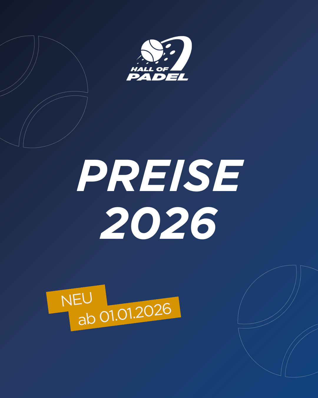 Ab dem 01.01.2026 gelten teilweise neue Preise in der HALL OF PADEL. Diese gelten für unsere Standorte in Wolfenbüttel und Braunschweig. Detaillierte Informationen findet ihr auf unserer Webseite > https://hallofpadel.com/booking/#preise